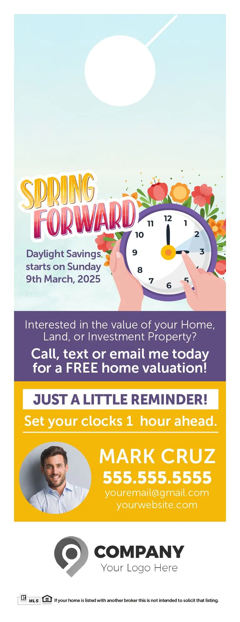 Choose from our delightful selection of daylight savings-themed templates, each ready to customize with your unique details. Use our easy-to-navigate 🚀 Express Editor to personalize, or upload your custom design to make your door hangers truly one of a kind. Can’t decide? Collaborate with our creative team to bring your vision to life. 🌞