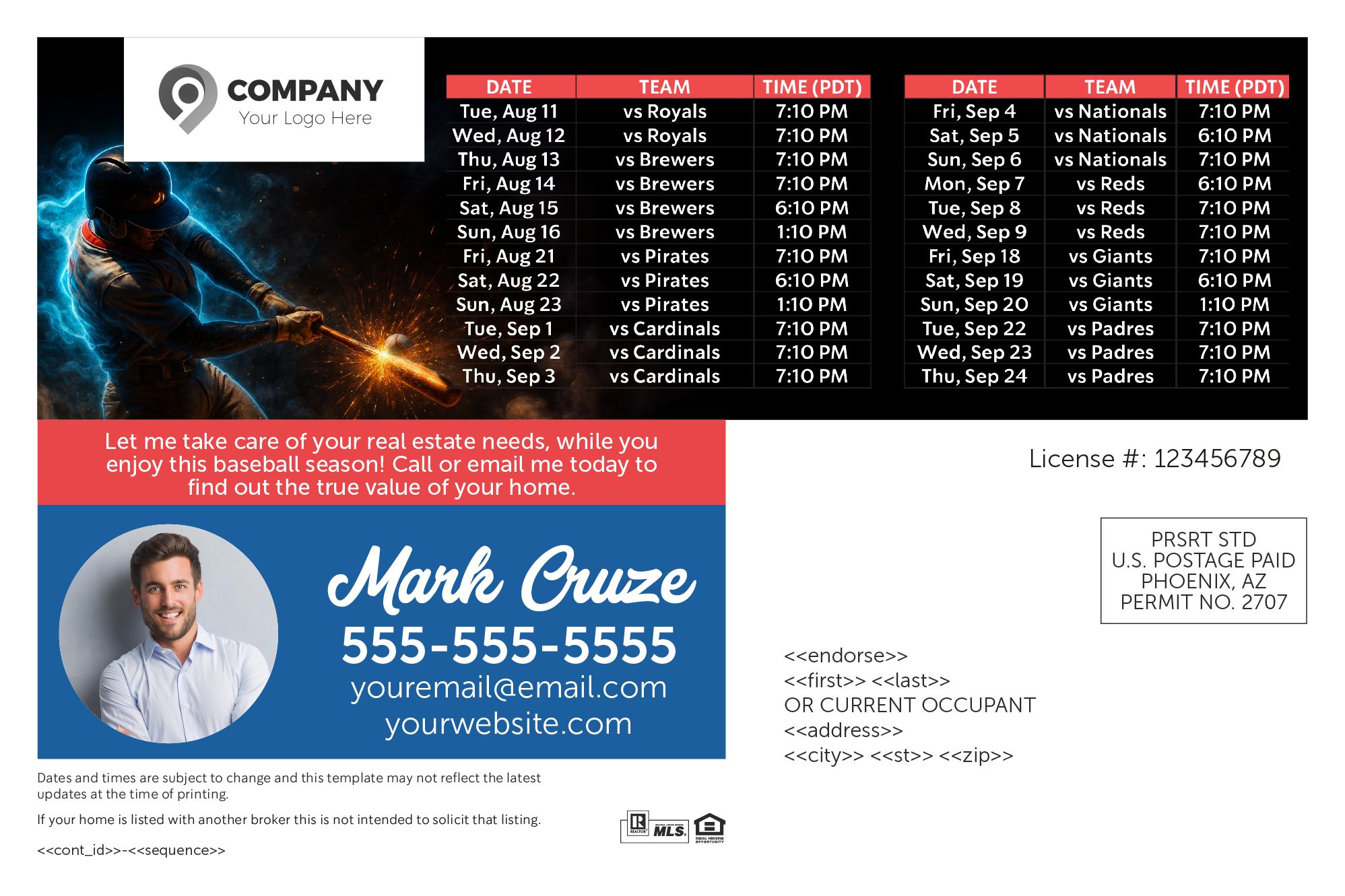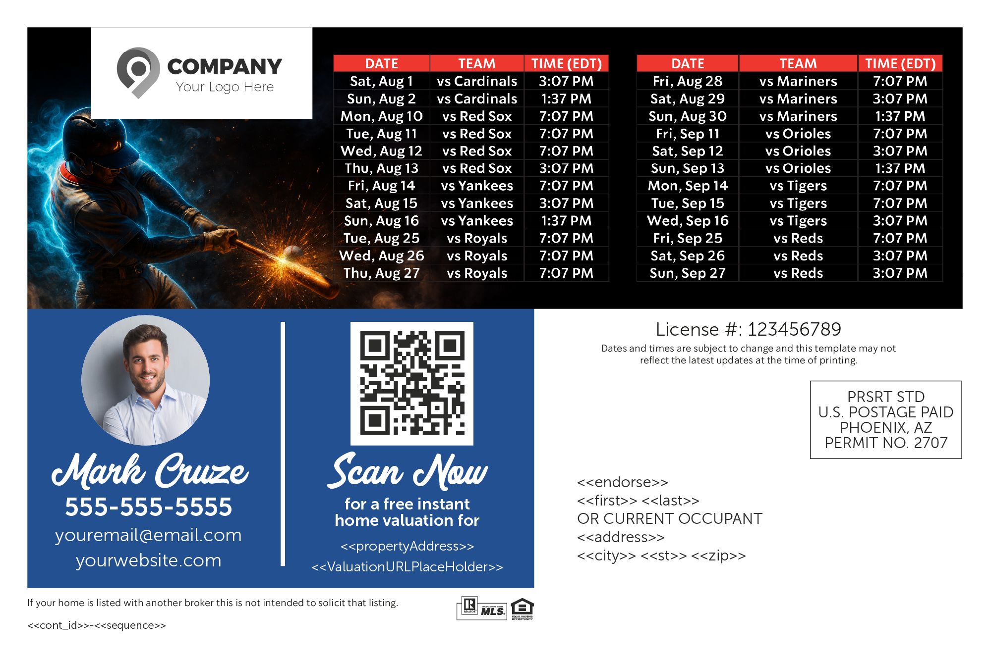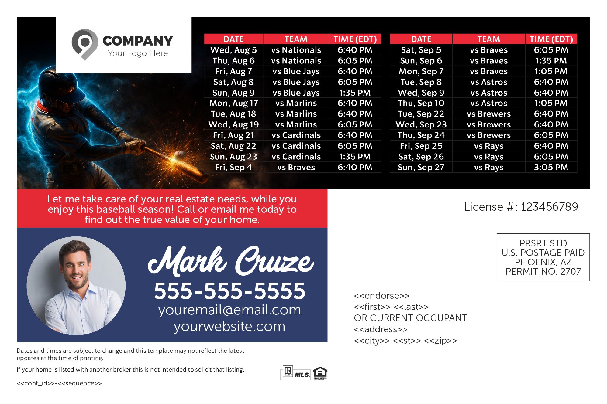 Baseball Schedule Postcards are a fantastic way for real estate agents to connect with their local community and stay highly visible throughout the baseball season.