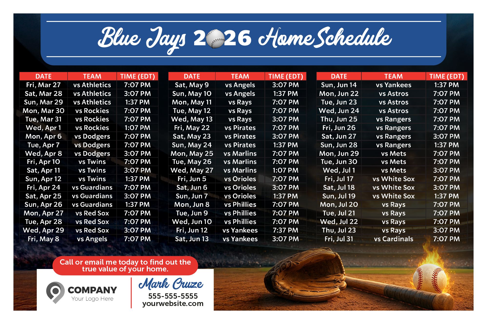 By including your branding and a call to action, these baseball schedule templates serve as both a helpful resource and a subtle marketing tool. Add a QR code that directs recipients to your website or offers a free home valuation, notifying you when someone engages with your content.