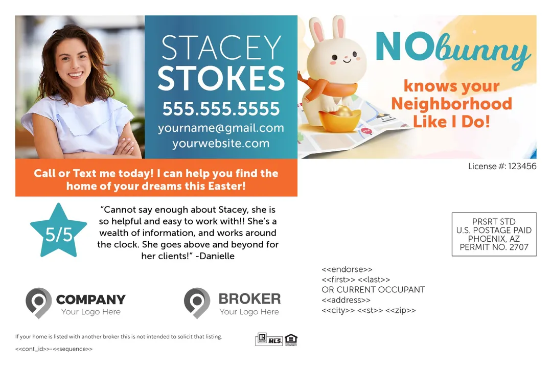 We update all mailing lists with the USPS National Change of Address database, ensuring your real estate Easter postcards reach homeowners even if they’ve recently moved. This maximizes your campaign’s reach and impact.