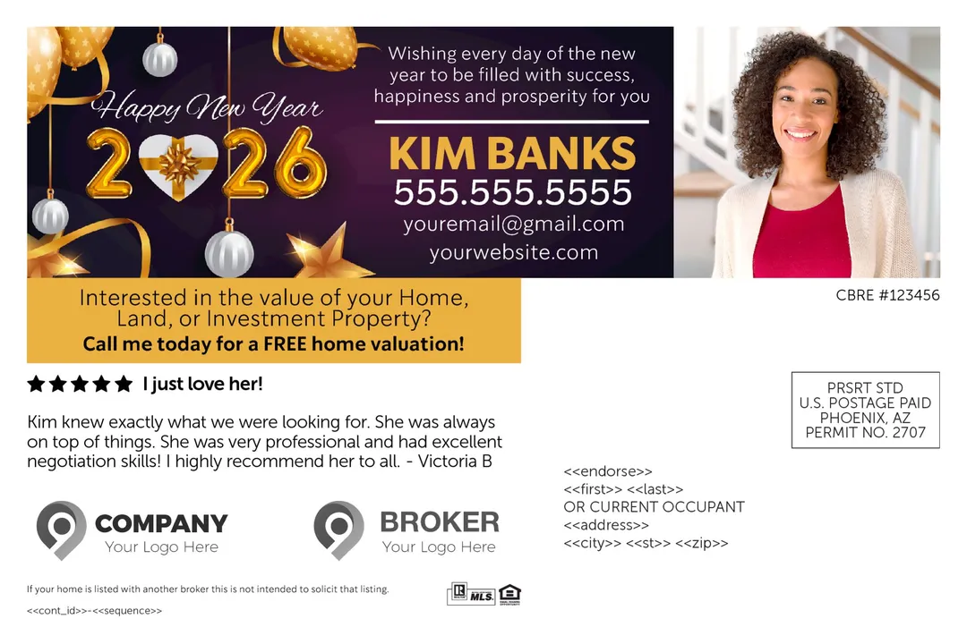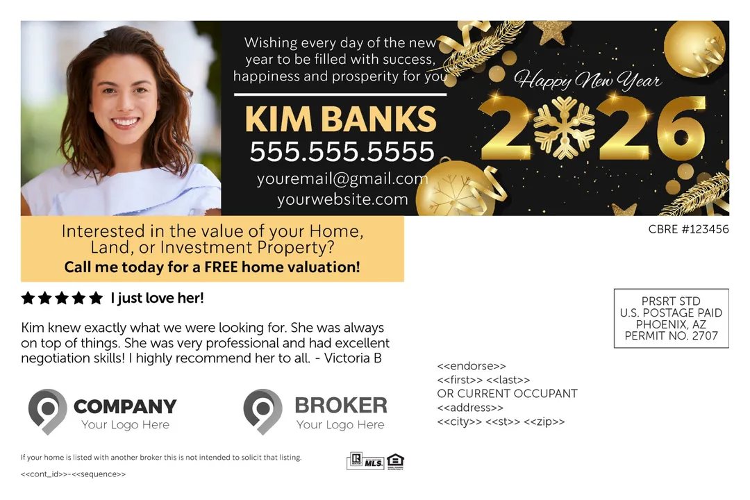 Integrate our New Year’s Postcards into your marketing campaigns, including Just Listed, Just Sold, Under Contract, Open House, and Market Update to enhance your outreach efforts. By doing so, not only do you reinforce your market presence, but you also demonstrate professionalism and gratitude.